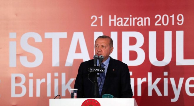 23 Haziran seçimlerine yönelik konuşan Cumhurbaşkanı Erdoğan, “Büyükşehir seçimlerinde birleştirme tutanaklarında 30 bini hukuksuz sandık kurulu başkanlarının da 212 bini bulan şüpheli bir durum ortaya çıktı. İki aday arasındaki fark 29 binlerde 13 binlere indi. Yüksek Seçim Kurulu bu durum karşısında yenileme kararı aldı. Yenileme sadece İBB mahsus değildir. Pek çok ilçede ve beldede kararlar verildi. Pazar günü önümüzdeki 5 yıl boyunca kendisini yönetecek başkanı seçecek. İstanbul’u yönetmek için kimin gerçekten hazırlığı olduğunu sizler biliyorsunuz. Buranın sorumluluğunu İstanbul’un emanetini layıkıyla taşıyacak aday bellidir. Bu noktada ben sizlerin basiretine ve ferasetine güveniyorum. İstanbullunun geleceğine yönelik en isabetli kararı vereceğine yürekten inanıyorum. Sizlerden ricam çevrenizde şayet CHP, HDP, İyi Parti, Saadet Partisine veya diğerlerine oy verenleri İstanbul’un istikbaliyle ilgili kanaatlerinizi onlarla paylaşmanızdır. 1994 yılında hangi şartlarda teslim aldığımızı ve hangi zorluklarla bu hale getirdiğimizi unutmadık. Ama genç nesil bunları bilmiyor. CHP adayının bizim 1994 yılında teslim aldığımız zihniyetin çok daha geri, çok daha ilkesiz, çok daha beceriksiz modeli olduğunu bu kişiyi yakından tanıyan en azından sözlerindeki tutarsızlıkları tespit eden herkes biliyor. Cumhurbaşkanı olarak bizim şahıslarla işimiz olmaz. Bizim bütün mücadelemiz bu şehri İstanbul’un bir daha benzer bir felakete maruz kalmaması içindir” ifadelerini kullandı.