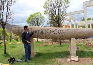 Oltu 25 Mart Gençlik Parkı'nda bulunan 10 bin yıllık dikili taşın üzerine boya ile 'Devrimci Sol' yazdılar. Yazıyı silmekle görevlendirilen belediye görevlisi de yazıyı spiral ile silmeye çalıştı.