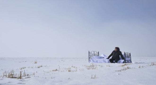 Prof. Mehmet Kavukcu, yersiz-yurtsuz deyiminin bir açılımı olan, düz ve boş bir arazide, şiddetli soğuk ve fırtına eşliğinde yatak, yorgan, yastık gibi objelerin kullandığı bir çalışma gerçekleştirdi. Performansın, bir serinin ilk çalışması olması yanı sıra, mülteci sorununa değinen ve yerinden yurdundan edilen insanları anlatan bir dil amaçladığını kaydeden Prof. Mehmet Kavukcu, "Günümüz sanatının dili ile gerçekleştirilen bu performansta, terör ve şiddete vurgu yapılmaktadır. Aynı zamanda, günümüz koşullarının getirdiği bir sonuç olarak, yalnızlaşan ve yalnızlaştırılan insanı da anlatmayı amaçladım. Kavramsal bir dil ile desen, fotoğraf, video-art ve boya ile bir performans dili doğal iklim koşullarında gerçekleştirilmiştir. Yaşadığımız bütün mevsimlerde, farklı doğal ortamlarda bu performans kendine özgü etki alanlarıyla anlam ve görsel derinlikler kazanacaktır. İlk insandan günümüze, insan algısında yer alan insan-yatak olgusu, temelde korunaklı, saklı, güven veren bir mekana ihtiyaç duyar" dedi.