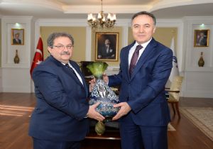 Vali Altıparmak’ta ziyaret anısına Rektör Doğru’ya Erzurum logolu çini tabak hediye etti.