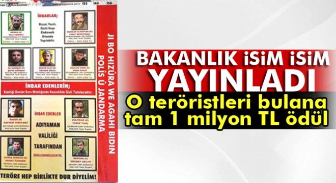 Afişte yer alan Kahramanmaraş doğumlu (Renas) kod adlı Veli Temirci için 1 milyon TL, Kahramanmaraş doğumlu (Nurhak Elbistan) kod adlı Fırat Berkpınar’a 300 bin TL, Bitlis doğumlu (Ali Norşin) kod adlı Şefik Körman’a 300 bin TL, Adıyaman doğumlu (Bezar Elçi) kod adlı Abuzer Arıca için 300 bin TL, Diyarbakır doğumlu (Mazlum Amed) kod adlı Sinan Donat için 300 bin TL ödül verilecek.
