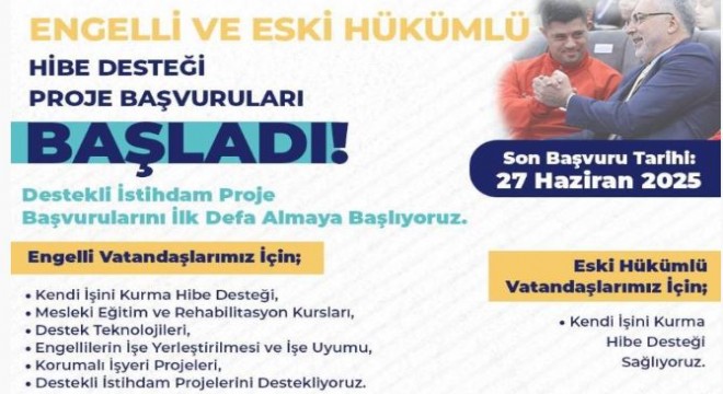 ‘Engelli Kendi İşini Kurma Hibe Desteği Projesi’ kapsamında 580 bin liraya kadar, Eski Hükümlü Kendi İşini Kurma Hibe Desteği Projesi kapsamında 435 bin liraya kadar, ‘Korumalı İş Yeri Desteği’ kapsamında ise 720 bin liraya kadar destek verilecek.