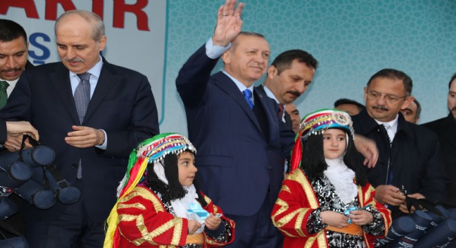 Diyarbakır’ın Türkiye’nin kalbi olduğunu söyleyen Cumhurbaşkanı Recep Tayyip Erdoğan, ülkeyi bölmeye çalışanlara seslenerek, ülkeyi böldürmeyeceklerini söyledi. Erdoğan, “Ülkenin yönetiminde sorumluluk sahibi olduğum sürece ne terör örgütünün çapulcuları, ne de başka bir musibet size dokunamaz. Bunun teminatı biziz. Sizin hakkınıza el atmaya kalkan karşısında bizi bulur. Türkiye nasıl İstanbulsuz, İzmirsiz, Antalyasız, Erzurumsuz olamazsa asla Diyarbakırsız da olamaz. Çünkü Diyarbakır bizim kalbimiz. Bu halkı bizden koparmak isteyen kalbimizi söküp almaya çalışıyor. Diyarbakır Türkiye’nin mührüdür el uzatılmasına izin vermeyiz. Aydınlık bir gelecek bizi bekliyor. 16 Nisan ülkemizle birlikte Diyarbakır için de yeni bir dönemin müjdecisi olacaktır. Diyarbakır’dan öyle seslenin ki tüm dünya duysun. Büyük Türkiye, güçlü Türkiye için evet mi? İstikrarlı Türkiye evet mi? Diyarbakır beni mahcup etmeyecek değil mi?” ifadelerini kullandı.