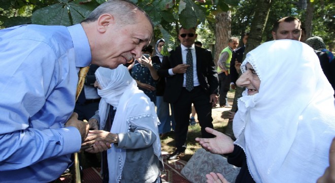 Makam aracından inen Erdoğan, ağaç altında oturan yaşlı iki kadına sarılarak elini öptü ardından çocuklarla bol bol fotoğraf çektirdi.