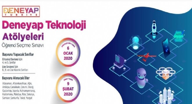 Geleceğin bilim adamları, araştırmacıları, girişimcileri olabilecek öğrencileri ortaya çıkarmayı amaçlayan Deneyap Teknoloji Atölyeleri; Adıyaman, Afyonkarahisar, Ağrı, Antalya, Çanakkale, Çorum, Elazığ, Gaziantep, Isparta, Kahramanmaraş, Kastamonu, Malatya, Rize, Sakarya, Samsun, Şanlıurfa, Tokat ve Yozgat’ta kurulacak. 100 binden fazla başvuru olacağı tahmin edilen Deneyap için iki aşamalı sınav yapılacak. Şubat ayında yazılı sınavı geçen öğrenciler, Mart'ta uygulamalı sınavda ter dökecek. 18 şehirde yaklaşık yeni 2 bin 900 öğrenci Nisan ayında eğitime başlayacak. Her bir şehirde toplam 160 öğrenci eğitim alacak. Bunların yaklaşık 100’ünün ortaokul, 60’ının lise öğrencisi olması öngörülüyor.