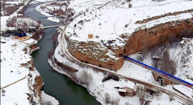Erzincan’da yağan yoğun kar yağışının ardından her taraf beyaz örtüyle kaplanırken, Doğu Ekspresi treninin İliç-Kemah-Erzincan güzergahında geçişi masalsı görsel oluşturdu.