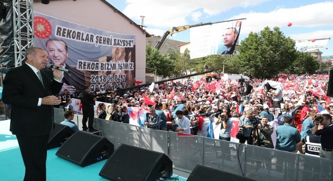 Türkiye olarak 24 Haziran'da sadece kendi tarihimizde değil dünyada parmakla gösterilecek bir demokrasi şöleni yaşandığını ifade eden Cumhurbaşkanı Erdoğan, “Tam bir demokratik olgunluk içerisinde seçim gerçekleştirdik. Bu sürecin asıl mimarı milletimin ta kendisidir. Bizler bu mücadelede gerekirse yedi düvele karşı meydan okumaktan çekinmedik, çekilmeyeceğiz. Suni döviz artışları yapıyorlar. Bu saldırıların sebeplerinin çok başka olduğu açıktır. Bu tarz yaklaşımlar sergileyen ülkelerle aramızdaki ilişkiler telafisi olmayacak noktaya geldi. Çıkarlarımızın uyuştuğu noktalarda iş birliği yapıyoruz. Konu Türkiye’yi köşeye sıkıştırmaya geldiğinde iş değişir. Kusura bakmasınlar bizim bu noktada kimseye eyvallahımız olmaz olamaz. Tanktan uçaktan toptan kurşundan korkmayan bu millet bu tarz tehditlerden mi korkacak? Tüm olumsuz ihtimallere karşı hazırlıklıyız. Döviz kurlarına bakıp el ovuşturanlar heveslenmesinler. Faiz lobilerine sesleniyorum boşuna heveslenmeyin. Bu milletin sırtından kazanamayacaksınız. Bu milleti çökertemeyeceksiniz. Bunlar bizim için ancak dönemsel araçlar olabilir. Bu araç dün şu olur yarın bir başkası olur. İran'dan Rusya'ya Çin'den kimi Avrupa ülkelerine kadar önemli mesafeler kat ettik. Asıl olan bizim yüreğimizdeki imandır. Bu haramzadelere vereceğimiz en büyük cevap ihracat ve istihdamı artırmak olacaktır. Milletimizin ellerindeki imkanları istihdam yolunda seferber etmesini istiyorum. Türkiye'yi içine çekilmeye çalışıldığı cendereden çıkarmanın tek yolu ileri atılmaktır. Gelin hep birlikte ileriye daha ileriye atılalım. Kimse sanmasın ki bu tekerlek tümsekte kalacak. Kimsenin gözü kur tablosunda faiz tablosunda olmasın" ifadelerine yer verdi.