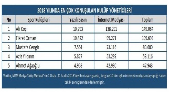 Medya Takip Merkezi'nin (MTM) Türkiye Spor Yazarları Derneği için hazırladığı 2018 yılı medya raporu açıklandı. Rapora göre, yıl boyunca spor kulüpler içerisinde en çok Fenerbahçe konuşuldu. Sarı lacivertli ekibi Beşiktaş ve Galatasaray takip etti.