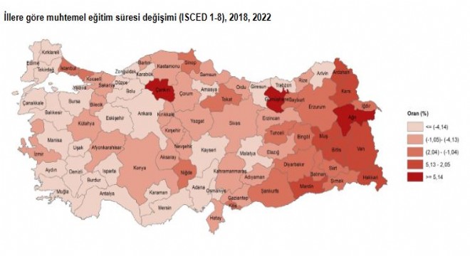 Muhtemel eğitim süresinin 2018-2022 yılları arasında en çok artış gösterdiği ilk beş il sırasıyla yüzde 8,2 ile Çankırı, yüzde 5,8 ile Gümüşhane, yüzde 5,2 ile Ağrı, yüzde 5,0 ile Van ve yüzde 3,5 ile Ardahan oldu. Aynı dönemde, muhtemel eğitim süresinin en çok düşüş gösterdiği iller sırasıyla yüzde 7,2 ile Eskişehir ve Antalya, yüzde 6,8 ile Düzce ve Isparta, yüzde 6,3 ile de Karabük ve Edirne oldu.