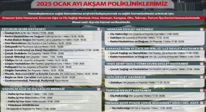 Erzurum Şehir Hastanesi, Erzurum Ağız ve Diş Sağlığı Merkezi, Hınıs, Horasan, Karayazı, Oltu, Tekman, Tortum İçe Devlet Hastanelerinde mesai saati dışında hizmet verilmektedir. ‘ kaydı düşüldü.