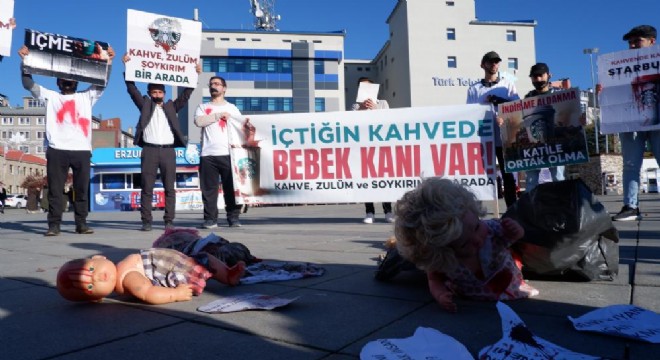 Erzurum’da bir araya gelen gençler, önce ABD'li ünlü kahve markası Starbucks'ın önünde eylem yaparak ABD ve İsrail’i protesto etti. Burada pankart açan grup, Gazze'de bebeklerin katledilişini temsilen yere kana bulanmış oyuncak bebekler koydu, ağızlarını bantlayarak dünya devletlerinin suskunluğuna dikkat çekti. “İçtiğin kahvede bebek kanı var. Kahve, zulüm ve soykırım bir arada. İçmezsen ölmezsin, içersen ölürler. Katile ortak olma” yazılı pankartlar açan grup, daha sonra Havuzbaşı Kent Meydanı’nda da benzeri bir eylem yaptı. Gruba zaman zaman vatandaşlar da destek verdi.