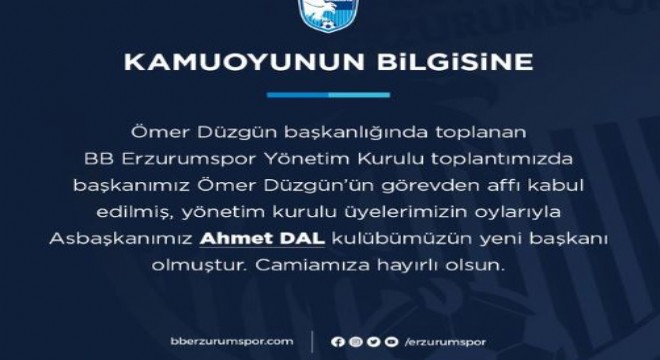Kulübün resmi sitesinden yapılan açıklamada, ‘Ömer Düzgün başkanlığında toplanan BB Erzurumspor Yönetim Kurulu toplantımızda başkanımız Ömer Düzgün’ün görevden af talebi kabul edilmiş, yönetim kurulu üyelerimizin oylarıyla Asbaşkanımız Ahmet Dal kulübümüzün yeni başkanı olmuştur. Camiamıza hayırlı olsun’ ifadelerine yer verildi.