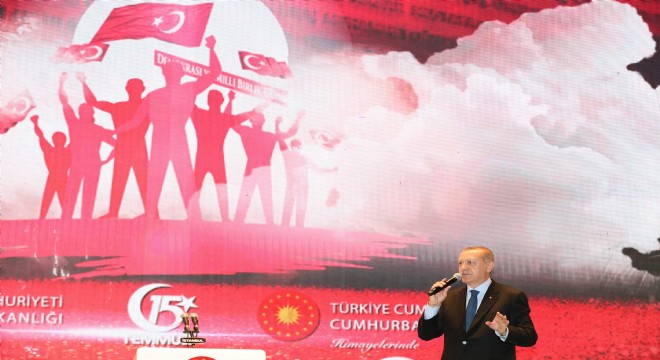 Türk milletinin 15 Temmuz'da FETÖ'cü alçaklara sokakları meydanları, köprüyü dar ettiğini söyleyen Cumhurbaşkanı Erdoğan, “Bu millet FETÖ eliyle Türkiye'nin hizaya sokulmasına izin vermemiştir. Bu milletin bir ferdi olmaktan iftihar ediyorum. 15 Temmuz Türk milletinin yeniden dirilişinin, şahlanışının, kendisine yönelen saldırı karşısında tekrar kıyama kalkmasının adıdır. 15 Temmuz tüm Türkiye'nin zaferidir. 15 Temmuz bizimle beraber dünyanın dört bir yanından adalet özgürlük mücadelesi veren tüm mazlumların zaferidir. Moskova'da da bu törenler yapılıyor. Bu nabız sadece bir noktada atmadı her yerde atıyor. Nasıl istiklal harbimiz ülkemizden yeni bir dönem başlatmışsa, 15 Temmuz zaferi de Türkiye'nin önünde yeni kapılar araladı. Bağımsızlığın korunmasının yanı sıra birlik ve kardeşliğin pekiştirmesine neden oldu. Yenikapı mitingiyle ete kemiği bürünen dayanışma iklimi başta terörle mücadele olmak üzere Türkiye'yi tüm cephelerde güçlendirdi. 7 ağustos Sayın Bahçeli'yle başladığımız yürüyüşte Cumhur ittifakıyla birlikte devam etti. Aynı kararlılıkla devam edeceğiz. FETÖ'nün devlette tasfiye sürecini hızlandırırken, yurt dışında PKK ve uzantılarına karşı başarılı operasyonlar gerçekleştirdi. Terör tehdidini kaynağın bertaraf ettik. Cerablus'ta 3 bin DEAŞ'lıyı derdest ettik. 4 bin 600'e yakın teröristi Cerablus'ta yok ettik. İçeride 1400’ü aşkın teröristi aynı şekilde etkisiz hale getirdik. İnlerine gireceğiz dedik inlerine girmeye devam edeceğiz. Onlar kaçacak biz kovalayacağız. Bu milletin huzurun kaçıranlar karşılarında bizi bulacak. Yeni yönetim sistemiyle birlikte tüm dünyada büyük bir sıçrama gerçekleştireceğiz. Hep birlikte göreceğiz. Endişeniz olmasın. Hem milletimizi hayaliyle buluşturduk ve büyük bir çileden kurtardık. Türk demokrasisine çağ atlattık. Darbe defterini bir daha açılmamak üzere kapattık" diye konuştu.