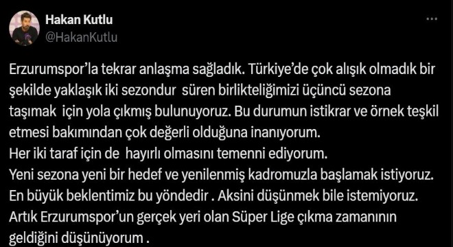 Erzurumspor Teknik Direktörü Hakan Kutlu, ‘Erzurumspor’la tekrar anlaşma sağladık. Türkiye’de çok alışık olmadık bir şekilde yaklaşık iki sezondur süren birlikteliğimizi üçüncü sezona taşımak için yola çıkmış bulunuyoruz.’ dedi.