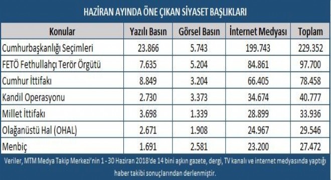 Medya Takip Merkezi'nin (MTM) yaptığı araştırmaya göre Türkiye, Haziran ayında en çok Cumhurbaşkanlığı seçimlerini konuştu. Fethullahçı Terör Örgütü (FETÖ), seçim ittifakları ve kandil operasyonu ise öne çıkan diğer başlıklardandı.