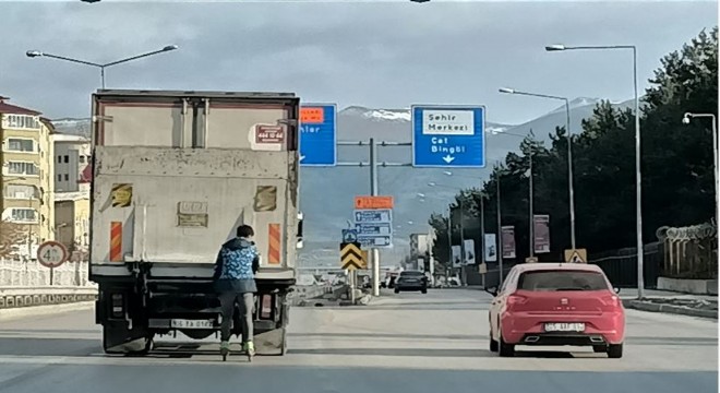 E-80 karayolu üzerinde seyir halindeki kapalı kasa bir kamyonun arkasına tutunan patenli genç, görenlerin yüreklerini ağza getirdi. Yaklaşık 2 kilometre kamyonla birlikte ilerleyen genç, sürücülerin uyarı kornolarına kulak asmadı.