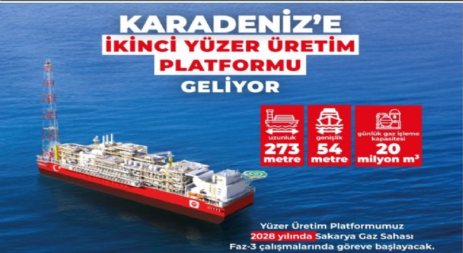 Enerji ve Tabii Kaynaklar Bakanlığı tarafından Karadeniz’deki Sakarya Gaz Sahası Geliştirme Çalışmalarını Faz-3 aşamasına taşıyacak önemli bir adım atıldı. Karadeniz’deki üretime destek verecek olan gemi formunda yeni bir Yüzer Üretim Platformunun (FPU) temini için Çin menşeli bir firma ile anlaşmaya varıldı. Mühendislik, tedarik, imalat, kurulum ve devreye alma faaliyetlerini kapsayan sözleşme kapsamında, Çin’de platformun üretimine başlandı.