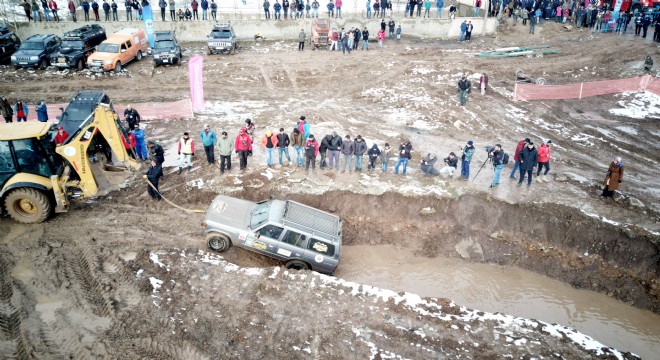 Yarışlar esnasında zorlu engelleri geçmeye çalışırken çamura saplanan, rampa ve çukurlarda kalan araçlar ise iş makineleri yardımıyla çıkarıldı.