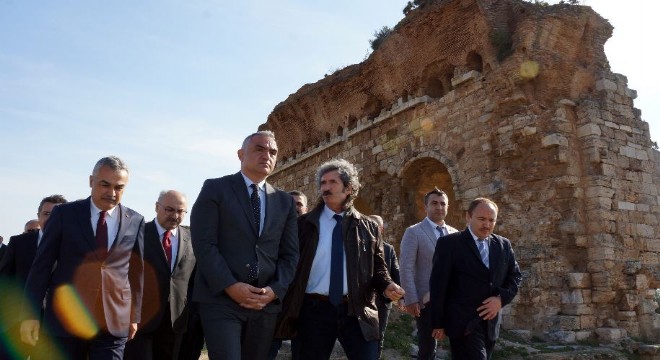 Bakan Ersoy, Tralleis’te yapılan kazı çalışmaları hakkında kazı başkanı Atatürk Üniversitesi Edebiyat Fakültesi Arkeoloji Bölümü Öğretim Görevlisi Prof. Dr. Nurettin Öztürk’ten bilgi aldı.