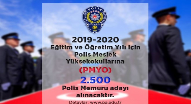 EGM’den yapılan açıklamada, “Emniyet Genel Müdürlüğü Polis Akademisi Başkanlığına bağlı Polis Meslek Yüksekokullarına 2019-2020 eğitim-öğretim dönemi için 2 bin 250 erkek, 250 kadın olmak üzere toplam 2 bin 500 öğrenci alımı yapılacaktır. Adaylar, 05-19 Ağustos 2019 tarihleri arasında http://www.pa.edu.tr adresinden e-devlet şifresi ile giriş yaparak ön başvurularını yapabilecektir.” denildi.
