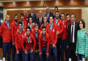 Erkekler Hentbol 1.Lig’de şampiyon olarak Süper Lig’e yükselen Aziziye Belediyesi Termalspor Hentbol Takımı’nın yönetici ve sporcuları, Erzurum Büyükşehir Belediye Başkanı Mehmet Sekmen’i ziyaret etti.