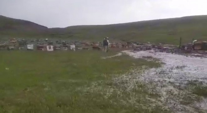 Tekman ilçesinde etkili olan sağanak ve dolu, arı kovanlarına zarara verdi.
