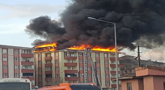 Erzurum’da 7 katlı apartmanın çatısında çıkan yangın korkuya neden oldu. Yangında apartmanın çatı katı alev alev yandı.