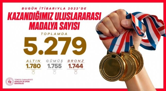 Gençlik ve Spor Bakanı Dr. Mehmet Muharrem Kasapoğlu, Türkiye’nin 2022 yılında 1780 altın, 1755 gümüş ve 1744 bronz olmak üzere toplamda 5 bin 279 madalya kazandığını duyurdu.
