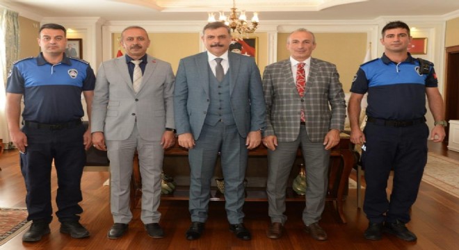 'Zabıta Haftası’nın 197. Yılı münasebetiyle;  Büyükşehir Belediyesi Genel Sekreter Yardımcısı Köksal Yavuz, Zabıta Daire Başkanı Suat Engin ve zabıta amirleri ile birlikte Vali Mustafa Çiftçi'yi makamında ziyaret etti.