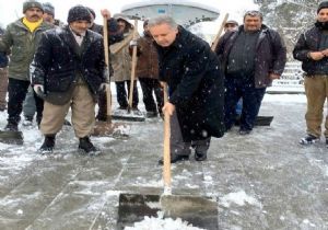 Erzincan Valisi Süleyman Kahraman Erzincan da yağan kar yağışı sonrası yerde biriken karları temizlemek için azimle çalışan Belediye İşçilerine yardım etti.