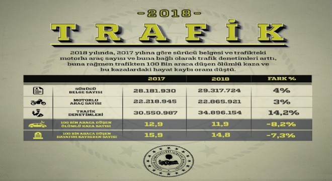 İçişleri Bakanlığı, 2018 yılında sürücü belgesi ve trafikteki motorlu araç sayısı ve buna bağlı olarak trafik denetimlerinin arttığına dikkat çekerek trafikten 100 bin araca düşen ölümlü kaza ve bu kazalardaki hayat kaybı oranının da düştüğünü açıkladı.