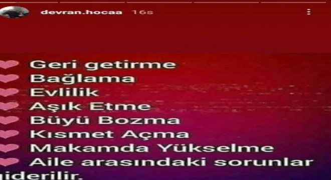 Malazgirt’te eşiyle sıkıntıları olan G.E. isimli kadın, bir arkadaşının tavsiyesi üzerine sosyal medya üzerinden Devran Yıldırım isimli sözde hocayla iletişime geçti. Sözde hocanın ‘Eşinde büyü var’ demesi üzerine korkan G.E., arkadaşından borç aldığı parayı şahsa verdi. Şahsın büyüyü bozmak için tekrar para istemesi üzerine "Param yok" diyen G.E., sözde hoca tarafından engellendi.