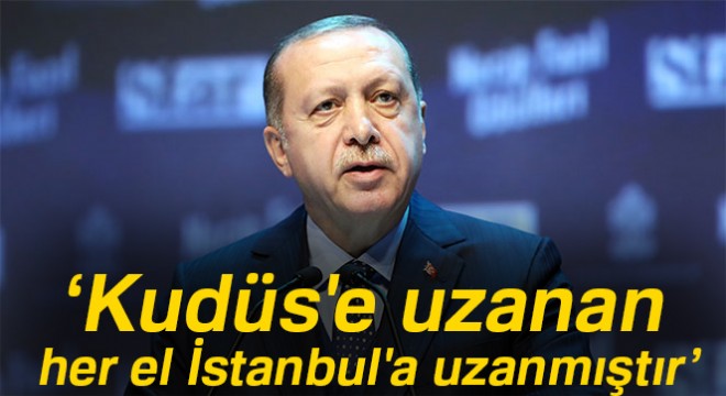 Kudüs’e uzanan eli İstanbul’a uzanmış saydıklarının altını çizen Erdoğan, “Biz İsrail istemiyor diye Filistin’in, Kudüs’ün hakkını savunmaktan vazgeçmeyeceğiz. Biz Amerika’nın başka hesapları var diye Suriye’de bir terör devleti kurulmasına izin vermeyeceğiz. Biz Irak’ın mezhep ve köken temelli bölünmesine seyirci kalmayacağız. Biz Avrupa Birliği’nin, NATO’nun, bir başka gücün ülkemiz ve milletimizi istiskal etme anlamına gelecek tavırlarına asla sessiz ve seyirci kalmayacağız. Dün Bosna’da nasıl kardeşlerimizin yanında yer aldıysak, dün Kafkasya’daki kardeşlerimizin mücadelesine nasıl destek verdiysek, dünyanın her köşesindeki kardeşimizi yalnız bırakmadıysak, bugün de çok daha güçlü ve kararlı şekilde bunu yapıyoruz ve yapacağız. Ecdadımızın emaneti olan bu vakur duruştan asla vazgeçmeyeceğiz. Bugün hala sizin Suriye, Irak, Kudüs’te ne işiniz var diyenler varsa, bunlar Türkiye’nin ne olduğundan da, tarihlerinden de haberleri olmayan gafillerdir. Bu coğrafyalar, buralarda yaşayan toplumlar, fiziki sınırlarımızın dışında olabilirler. Gönül sınırlarımızın tam ortasındadır. Onun için Kudüs’e uzanan her eli İstanbul’a uzanmış sayarız” diye konuştu.