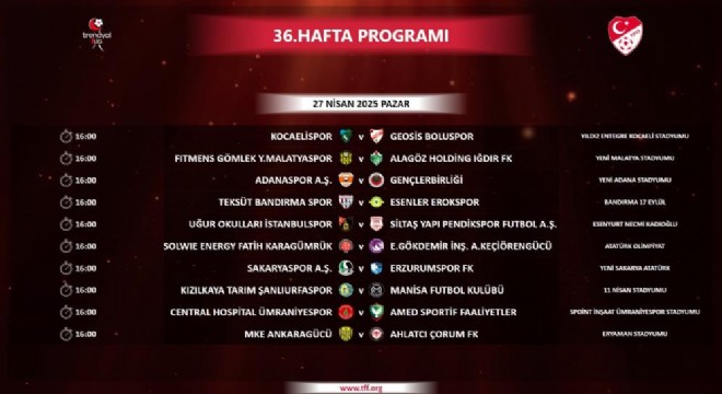 Buna göre 36. haftada tüm müsabakalar 27 Nisan Pazar günü saat 16.00’da yapılacak.