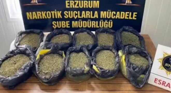 Erzurum Emniyet Müdürlüğü Narkotik Suçlarla Mücadele Şube Müdürlüğü ekipleri tarafından Erzurum-Erzincan karayolu üzerinde bulunan polis kontrol noktasında batı illerine uyuşturucu madde nakli yapan şahıslara yönelik yapılan çalışmalara istinaden şüphe üzerine bir araç durduruldu. Narkotik köpeği Eris’in araç içerisinde yaptığı aramada, aracın bagaj kısmında bulunan 2 adet valiz içerisinde 10 parça halinde 10 kilo 50 gram esrar maddesi ele geçirildi.