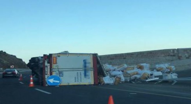 Köprüköy ilçesinde meydana gelen ilk trafik kazasında tır ikiye bölünerek devrildi. Kazada sürücü yaralandı.