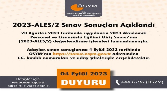 Ölçme, Seçme ve Yerleştirme Merkezi (ÖSYM) Başkanlığı tarafından 2023-ALES/2 sonuçları açıklandı.