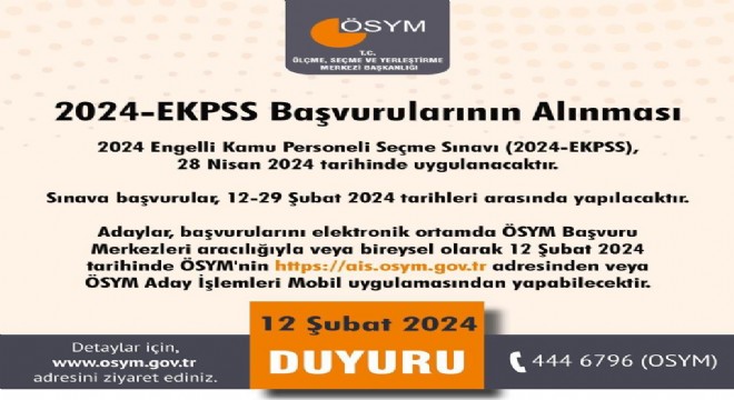 ÖSYM’den yapılan yazılı açıklama göre, 2024 Engelli Kamu Personeli Seçme Sınavı (2024-EKPSS), 28 Nisan 2024 tarihinde uygulanacak. Sınava başvurular, 12-29 Şubat 2024 tarihleri arasında yapılacak. Adaylar, başvurularını elektronik ortamda ÖSYM Başvuru Merkezleri aracılığıyla veya bireysel olarak ÖSYM'nin https://ais.osym.gov.tr adresinden veya ÖSYM Aday İşlemleri Mobil uygulamasından yapabilecek.