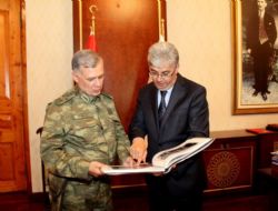 Vali Eyüp Tepe’de 3. Ordu Komutanı Orgeneral Ümit Dündar’ın ziyaretinden duyduğu memnuniyeti dile getirdi. Tepe, ziyaret anısına Dündar’a plaket ve Resimler Kars Kitabı’nı hediye etti. Tarihi Valilik Binası’nı da Orgeneral Ümit Dündar’a gezdiren Vali Tepe, bina hakkında da bilgiler verdi.