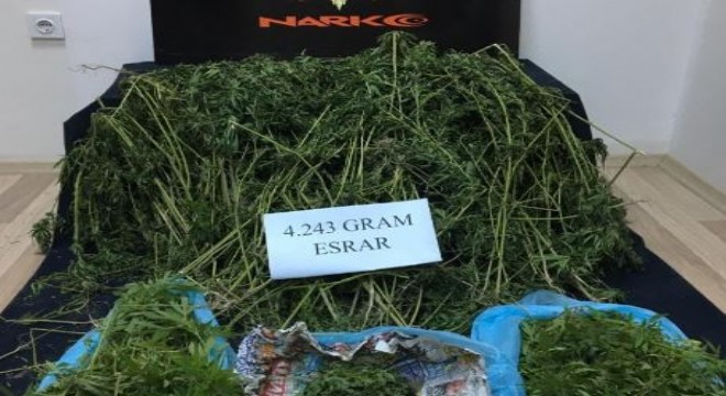 Bunun üzerine harekete geçen polis, adresi önceden belirlenen eve operasyon düzenlendi. Düzenlenen operasyonda şüpheli 1 kişi gözaltına alınırken, evde yapılan aramada 4 kilo 243 gram esrar ve 340 kök Kenevir bitkisi ele geçirilerek muhafaza altına alındı.