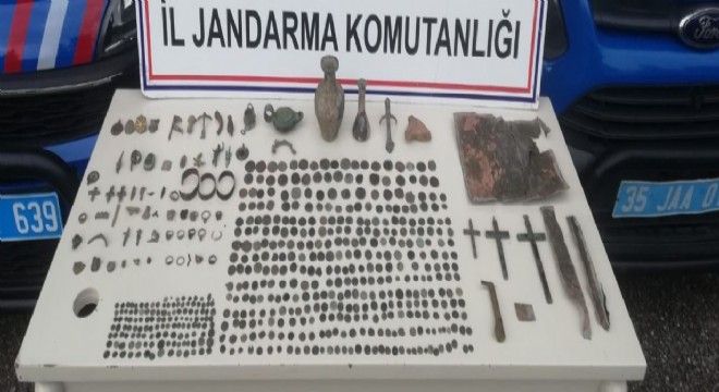 İzmir İl Jandarma Komutanlığı ekiplerince yürütülen çalışmalar neticesinde sosyal medya üzerinden tarihi eser pazarlamaya çalışan bir şahsın Erzurum’dan İzmir’e elinde bulundurduğu tarihi eserleri satmak için geleceği duyumu alındı. İzmir İl Jandarma Komutanlığı KOM Şube Müdürlüğü ile Torbalı İlçe Jandarma Komutanlığı ekiplerince tarihi eserlerin bulunduğu araca operasyon düzenlendi. Araçta yapılan aramada, şüpheliler E.A., M.F., H.Ö. ve Ş.K. ile birlikte klasik, Helenistik, Roma, Bizans, Selçuklu ve Osmanlı dönemine ait 499 adet sikke, bir adet tablet, 30 adet obje, 4 adet haç, 4 adet heykel, 2 adet vazo, bir adet kandil, 8 adet madalyon, 3 adet ok ucu, bir adet mühür, 3 adet kolye ucu, 16 adet yüzük, 3 adet bilezik olmak üzere 575 adet tarihi eser ele geçirildi. Şüpheliler hakkında yasal işlem başlatılırken, eserler müze müdürlüğüne teslim edildi.