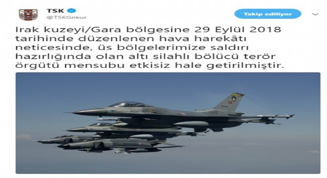 TSK'dan yapılan yazılı açıklamada, "Irak kuzeyi/Gara bölgesine 29 Eylül 2018 tarihinde düzenlenen hava harekâtı neticesinde, üs bölgelerimize saldırı hazırlığında olan altı silahlı bölücü terör örgütü mensubu etkisiz hale getirilmiştir" denildi