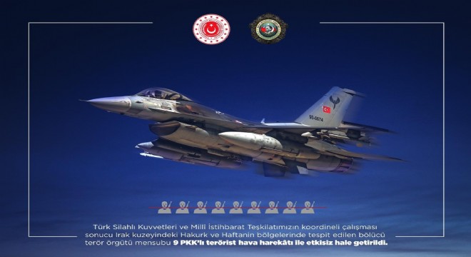 “Türk Silahlı Kuvvetleri ve Milli İstihbarat Teşkilatımızın koordineli çalışması sonucu Irak kuzeyindeki Hakurk ve Haftanin bölgelerinde tespit edilen bölücü terör örgütü mensubu 9 PKK’lı terörist hava harekatı ile etkisiz hale getirildi.”