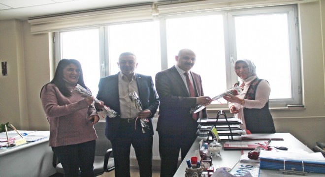 Kurumda görevli kadın personele karanfil dağıtan Erdal ve Diler, 8 Mart Dünya Kadınlar gününü kutladı.