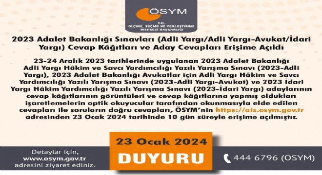 ÖSYM, resmi internet sayfasından yaptığı duyuruda, 23-24 Aralık 2023 tarihlerinde uygulanan 2023 Adalet Bakanlığı Adli Yargı Hakim ve Savcı Yardımcılığı Yazılı Yarışma Sınavı, 2023 Adalet Bakanlığı Avukatlar için Adli Yargı Hakim ve Savcı Yardımcılığı Yazılı Yarışma Sınavı ile 2023 İdari Yargı Hakim Yardımcılığı Yazılı Yarışma Sınavı sonuçlarının açıklandığını paylaştı.