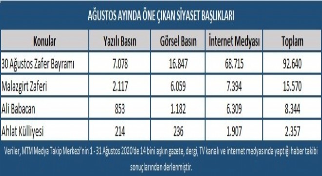 Medya Takip Merkezi (MTM), Ağustos ayında Türkiye ve dünya gündeminde öne çıkan siyasi ve toplumsal olayları araştırdı. 30 Ağustos Zafer Bayramı'nın 98'inci yıl kutlamaları ay boyunca medyada en çok yer alan konu olurken, Malazgirt Zaferi’nin 949’uncu yılına özel kutlama da medyada bolca yer aldı. Yeni açılan Ahlat Külliyesi de Ağustos ayının diğer gündem başlıklarıydı.