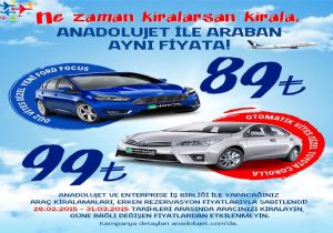 AnadoluJet, Enterprise işbirliği ile yolcularına sunduğu hesaplı araç kiralama hizmetine sabit fiyat kampanyasıyla devam ediyor. AnadoluJet yolcuları, 31 Mart 2015 tarihine kadar orta sınıf dizel düz vites araçları 89 TL’ye ve orta sınıf dizel otomatik vites araçları 99 TL sabit fiyatla kiralayabiliyor. Havadaki konforu karada da yaşamaya devam eden AnadoluJet yolcuları; araç sayısı, ofis yaygınlığı ve personel istihdamı ile dünyanın en büyük araç kiralama markası Enterprise ile iş birliğine devam ediyor. Bu iş birliği ile yolcularına sunduğu hesaplı araç kiralama hizmetini yepyeni bir kampanya ile sürdürüyor. Erken rezervasyon imkânıyla araç kiralama fiyatlarını sabitleyen AnadoluJet’in bu kampanyası kapsamında 31 Mart 2015 tarihine kadar araç kiralayan yolcular, değişen fiyatlardan etkilenmiyor.