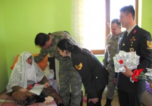 'Yaşlılar Haftası' münasebetiyle, Erzurum İl Jandarma Komutanı Albay Uysal Ağaoğlu ve ekibi, Özel Güzide bakım evinde bulunan yaşlıları ziyaret etti. Yaşlılarla tek tek görüşüp, sohbet eden Albay Uysal Ağaoğlu, yaşlılara karanfil ve hediyeler verdi. Albay Uysal Ağaoğlu, odaları gezerken yaşlı bir kadın, “Komutanım size türkü söyleyeyim mi?” dedi. Komutanın, “söyle” demesi üzerine, türkü söylemeye başlayan yaşlı kadın söylediği “Annem” türküsü ile komutanı duygulandırdı. Yaşlı kadınının türküyü söylediği anda Erzurum İl Jandarma Komutanı Albay Uysal Ağaoğlu’nun gözleri doldu.
