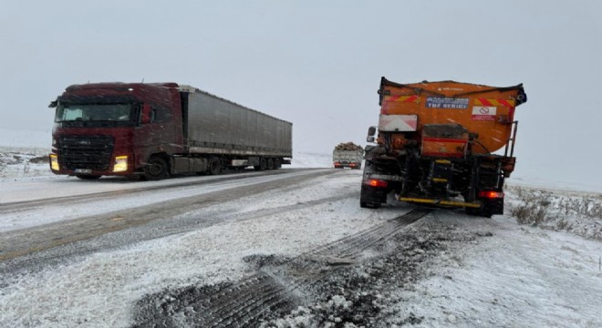 Ekipler yolun kapanmaması için aralıksız çalışmalarını sürdürürken, bir yandan da buzlanma yaşanan yolda tuzlama çalışması başlattı.