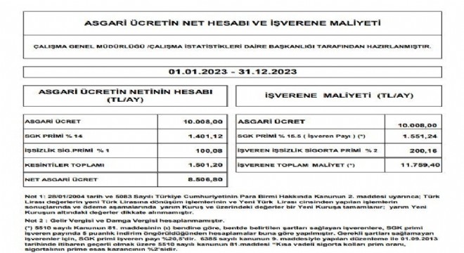Çalışma ve Sosyal Güvenlik Bakanlığı Çalışma Genel Müdürlüğü ve Çalışma İstatistikleri Daire Başkanlığı tarafından asgari ücretin net hesabı ve işverene maliyeti açıklandı.